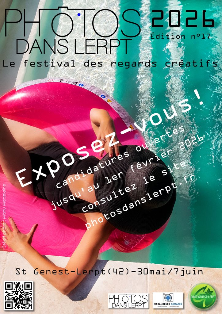 La 17ème édition du festival Photos dans Lerpt se tiendra du 30 mai au 7 juin 2026 à Saint Genest-Lerpt. Son succès dépend essentiellement de la qualité et de l’originalité de vos regards. Vous pouvez dès maintenant candidater jusqu’au 1er février 2026.